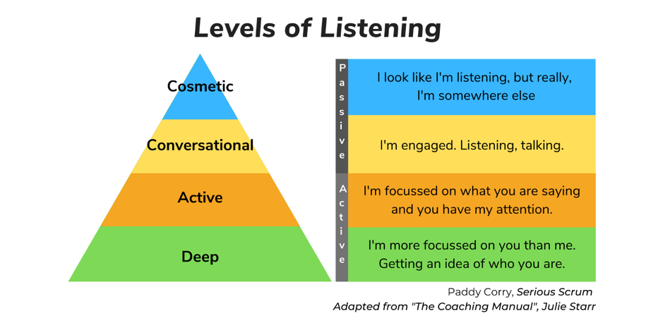 Julie Starr in her book The Coaching Manual shares her framework on how listening happens at four levels. This framework puts it across simply and is self-explanatory.