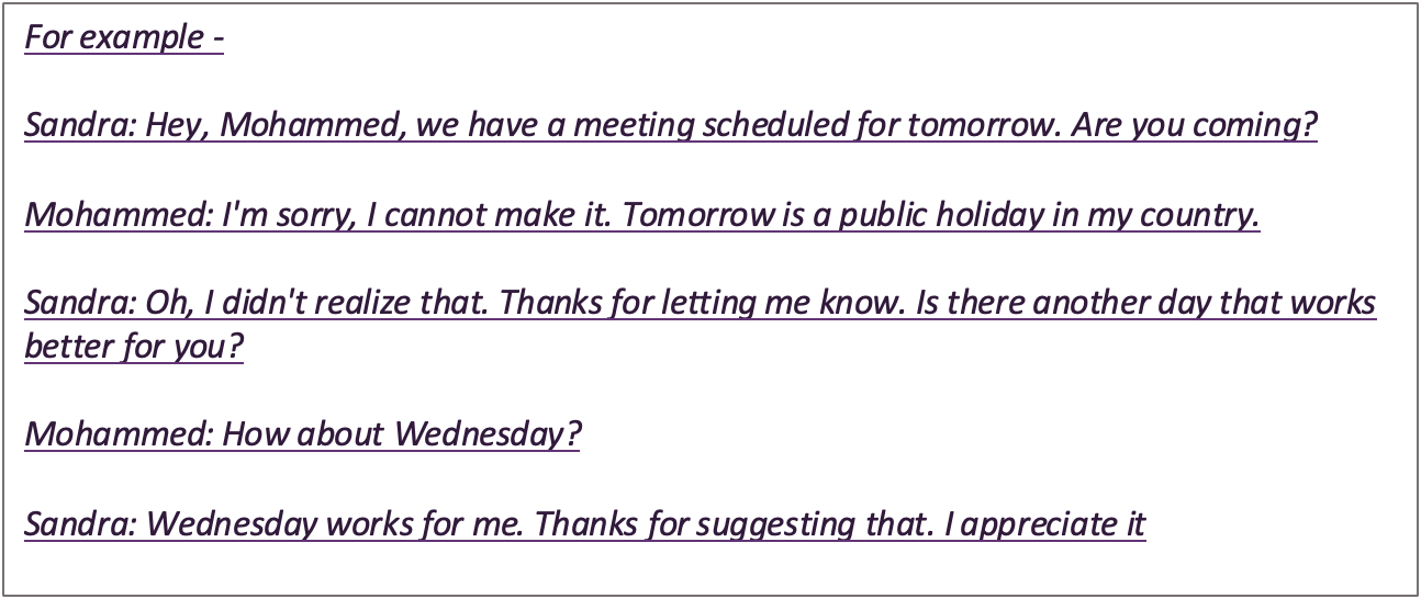 By being respectful of Mohammed’s cultural norms and showing empathy towards his situation, Sandra was able to find an alternative meeting time that worked for both.